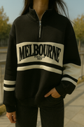 سويت شيرت مريح بسوستة نصفية وتطريز “Melbourne” بتصميم خطوط كلاسيكي على الصدر والأكمام. مصنوع من خامة ناعمة ودافئة بأساور وحافة مضلعة تمنح راحة وأناقة في نفس الوقت. مثالي لإطلالة كاجوال شتوية بطابع رياضي عصري.