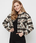 This soft wool-blend piece features a classic plaid pattern, front button closure, and flap chest pockets, combining a timeless look with a trendy cropped silhouette.