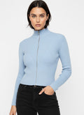 Designed with a high neckline, front zip closure, and fitted ribbed texture — this cardigan perfectly accentuates your shape while keeping your look sleek and feminine.