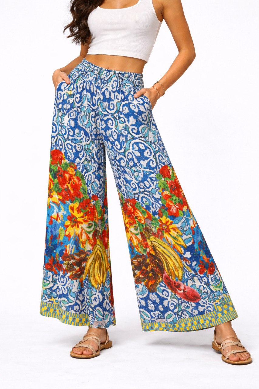 Wide-leg pants with a relaxed, comfortable fit and an elastic waistband. Featuring a vibrant artistic print that blends bold patterns, illustrated faces, and colorful elements, giving the design a unique and eye-catching look perfect for casual summer outfits.