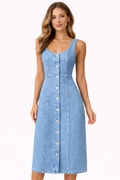 A feminine denim midi dress with a clean, flattering fit and full front button detailing. Designed for everyday wear, it offers a casual yet stylish look that’s easy to pair with different shoes for versatile outfits. Comfortable and practical for daily use