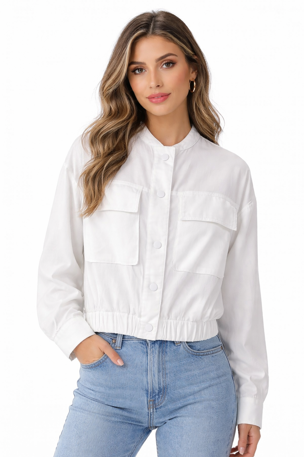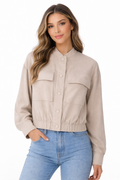 A lightweight jacket with a modern, effortless look, perfect for everyday wear. Designed with a stand collar, front button closure, and chest flap pockets, finished with an elasticated hem for a comfortable, flattering fit.