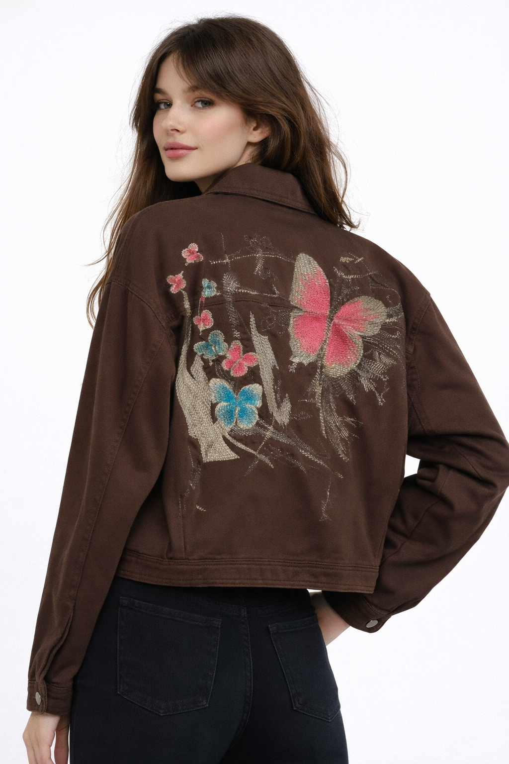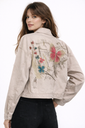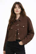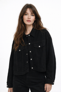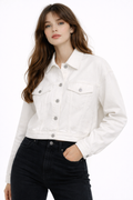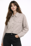 A modern cropped jacket with front buttons and practical pockets that adds a stylish touch to any outfit.