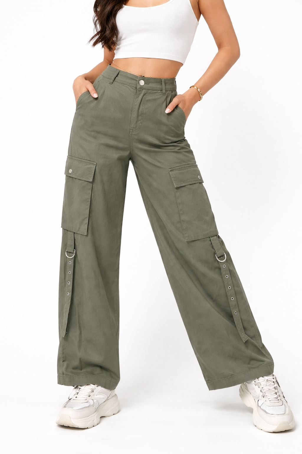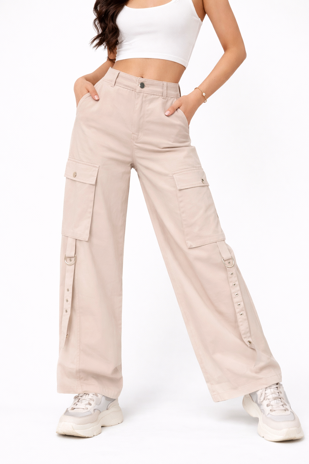 High-waisted wide-leg cargo pants with functional side pockets and metal strap details for a modern touch.
