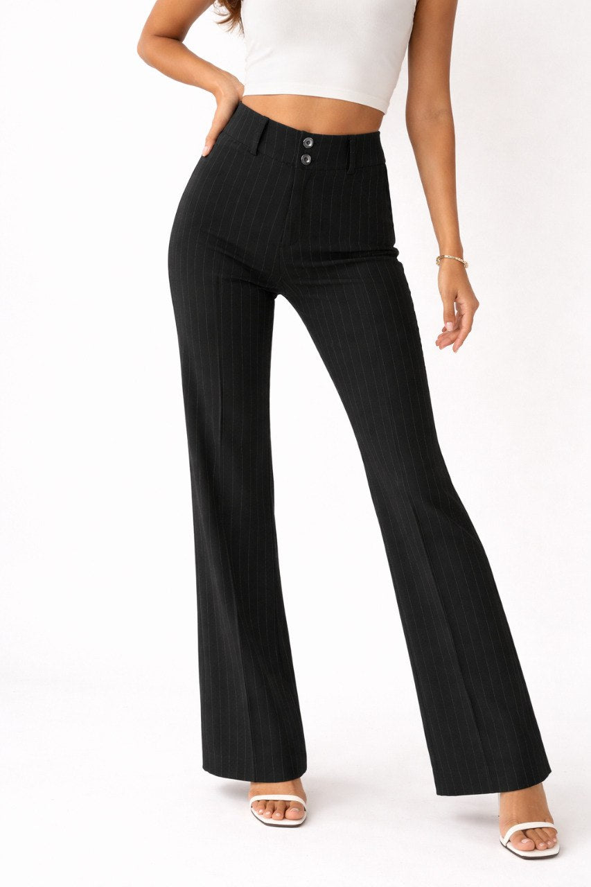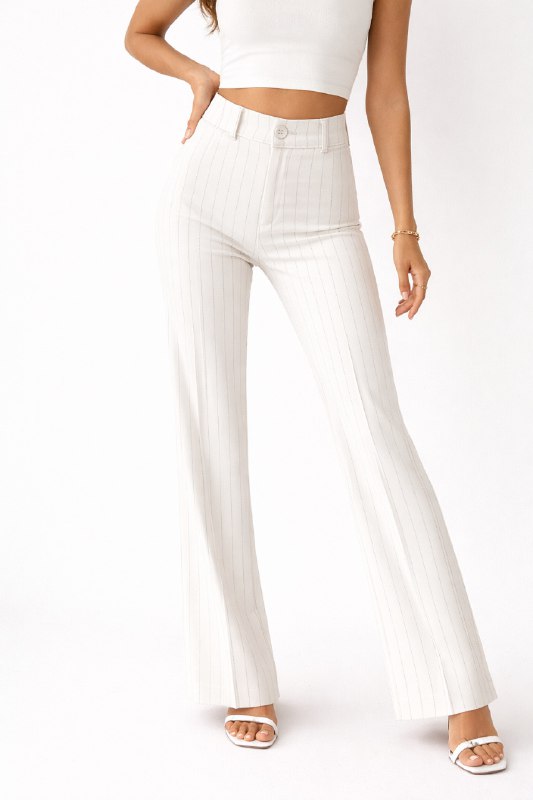 High-waisted women’s wide-leg pants with subtle vertical pinstripes for a sleek, elongated look.