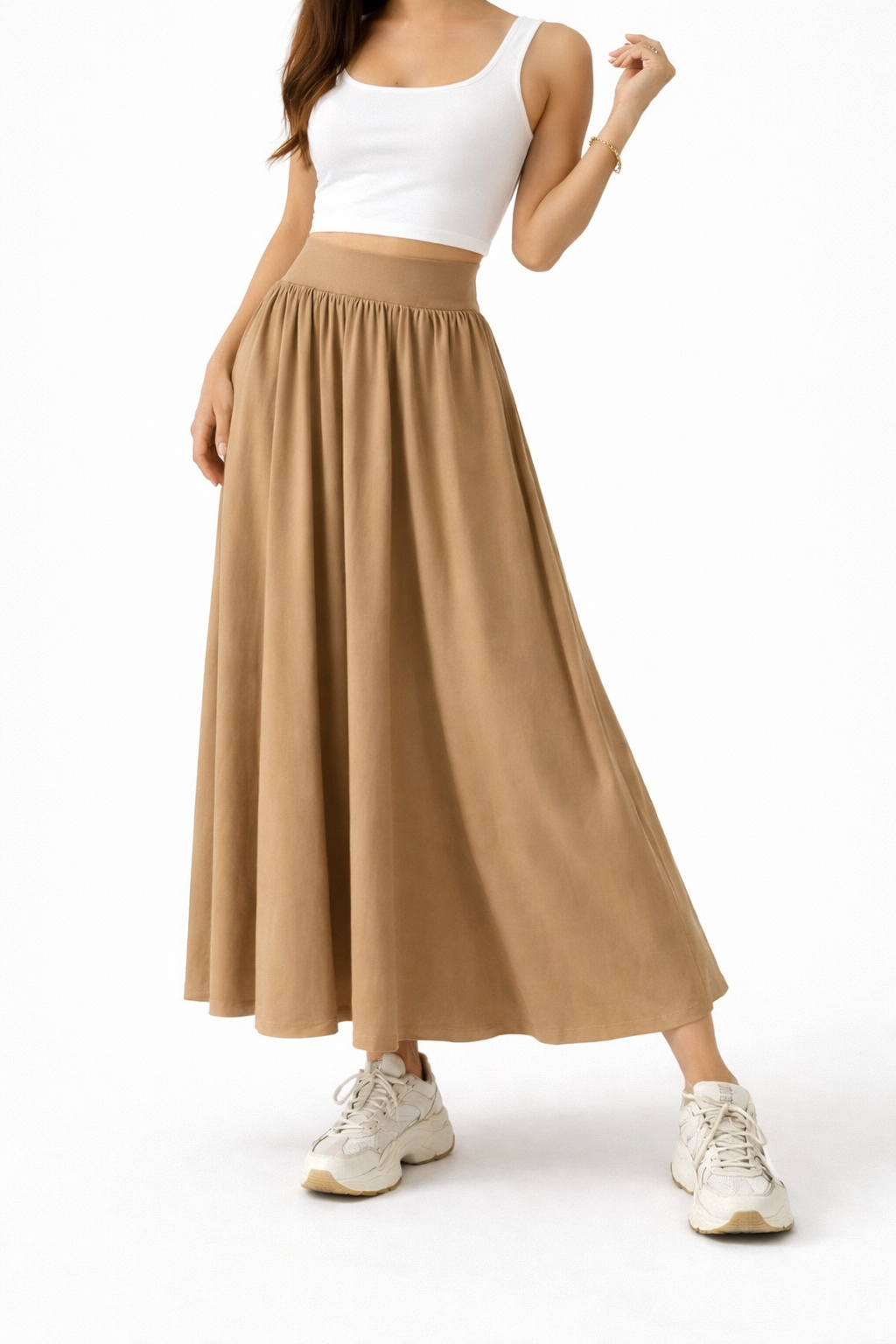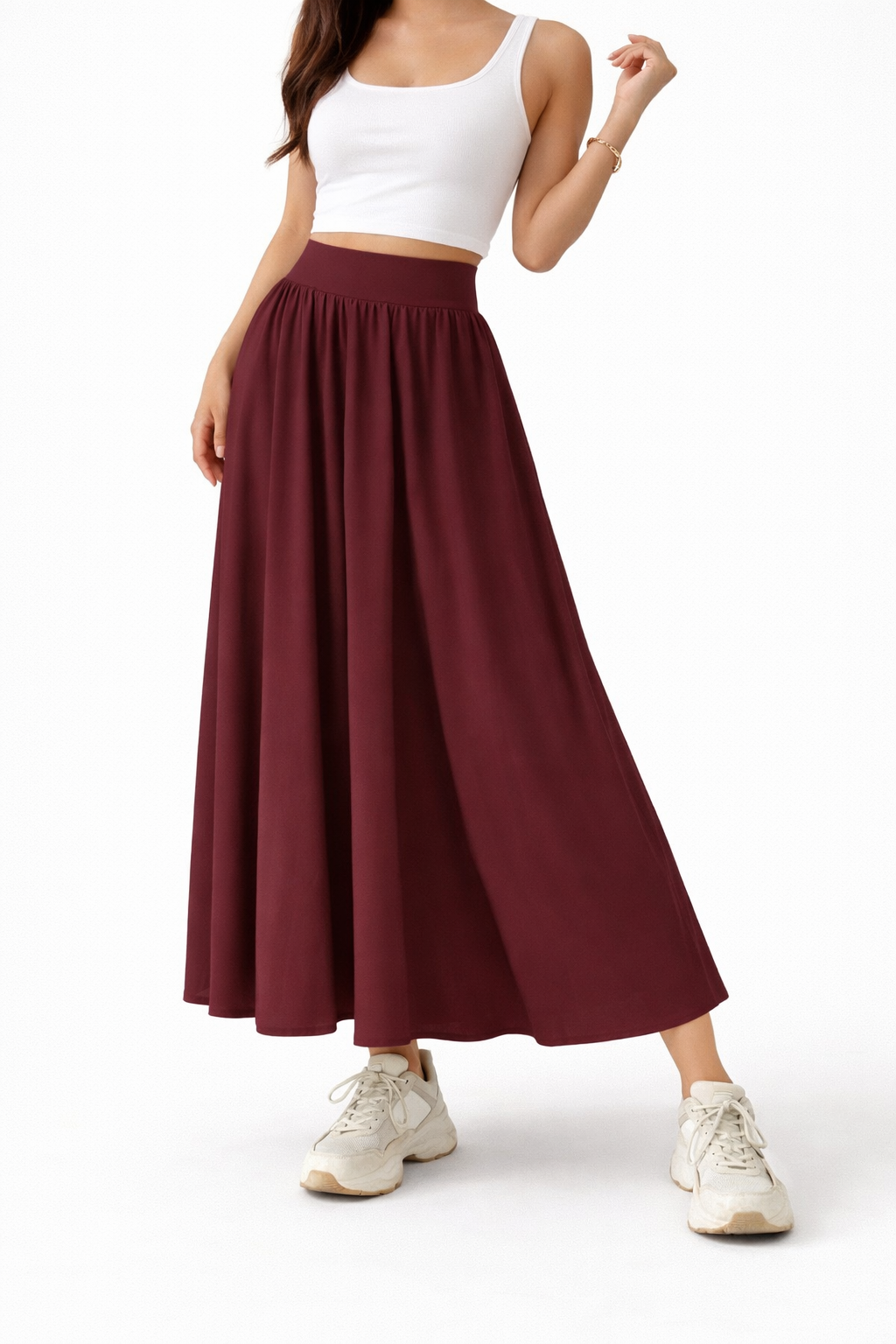 The Women’s Flared Midi Skirt features a flattering wide waistband and a flowy silhouette for an elegant, comfortable look.